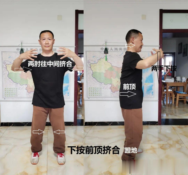如果你觉得我说的对,那就按我说的练。还有一些东西看感兴趣的人多不多了,有人顶就继续说:试试敛臀,脚尖向前微内扣,膝盖微屈,做到之后膝盖外展,体会一下这时候髋关节的感受。敛臀和脚尖向前微内扣就是内裹,膝盖微曲外展就是横撑,矛盾统一在一个位置那是绷劲,矛盾在全身自然统一成松沉。